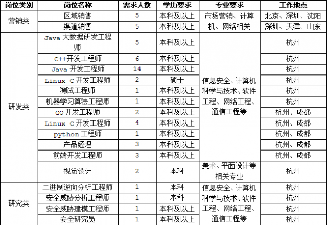 公司现有职员一千三百余人,公司主营业务涵盖云计算安全,大数据安全以及应用安全、数据库安全、移动互联网安全、智慧城市安全等,包括安全态势感知、威胁情报分析、攻防实战培训、顶层设计、标准制定、课题和安全技术研究、产品研发、产品及服务综合解决方案提供等。