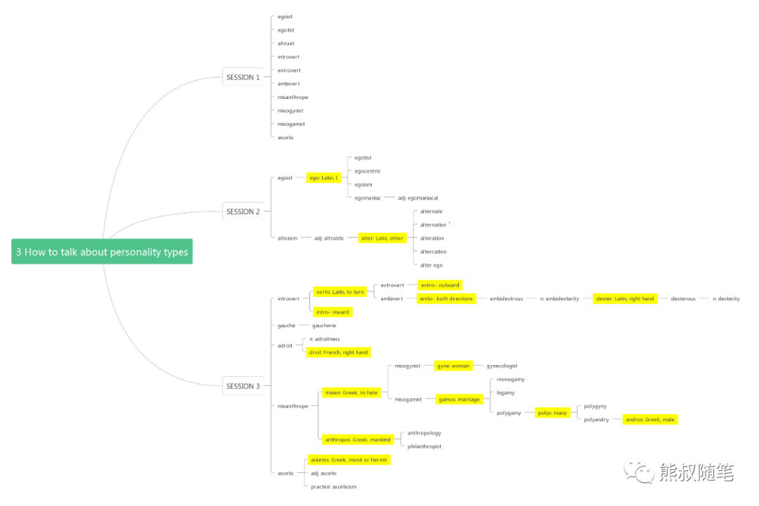 我将本单元的所有单词,包括词源和词性做了一个思维导图,其中所有词源都用黄色标注,大家可以自行查阅。